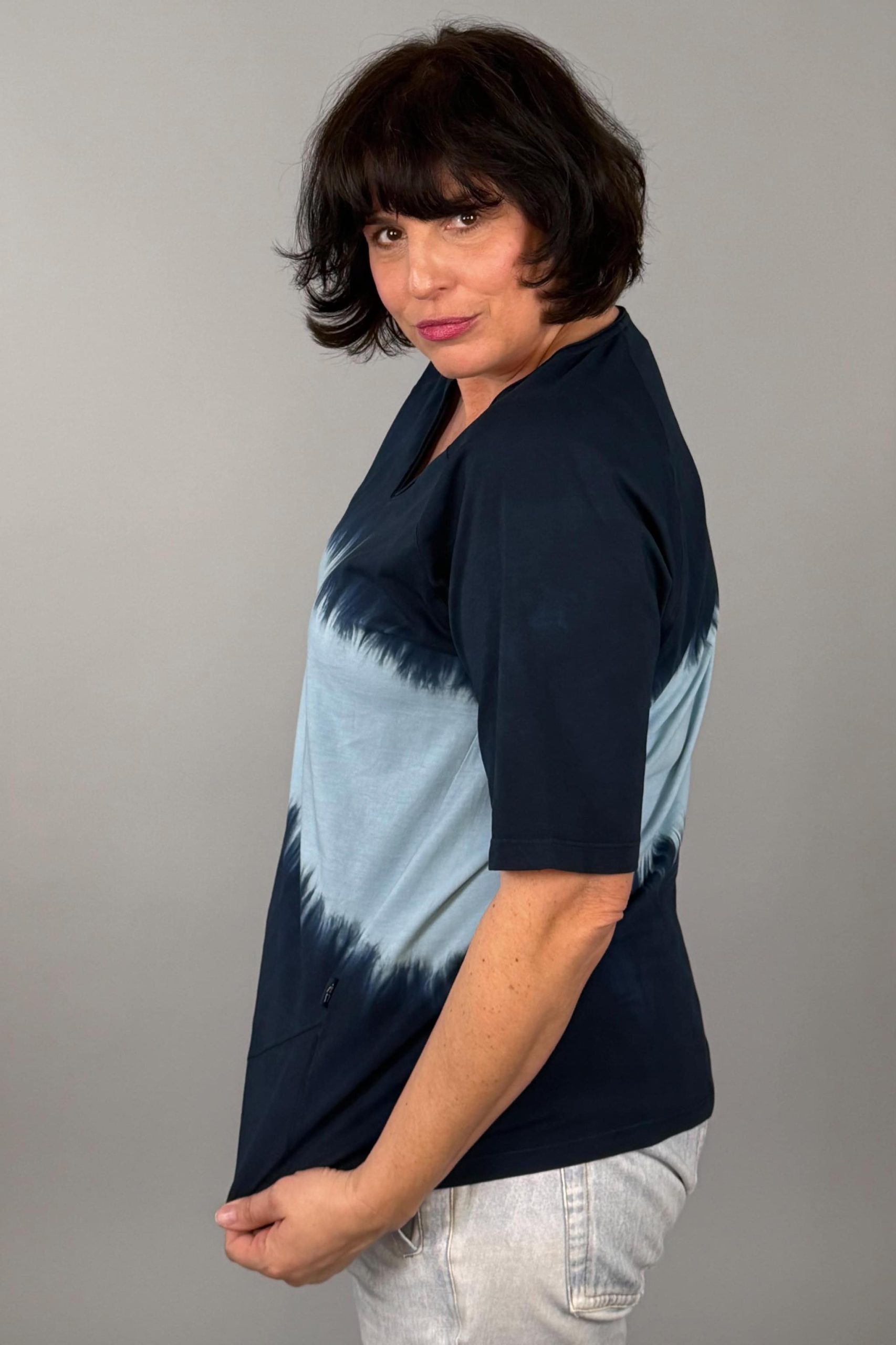 Mit weiblichem V-Ausschnitt und seitlich eingesetztem Dreieck